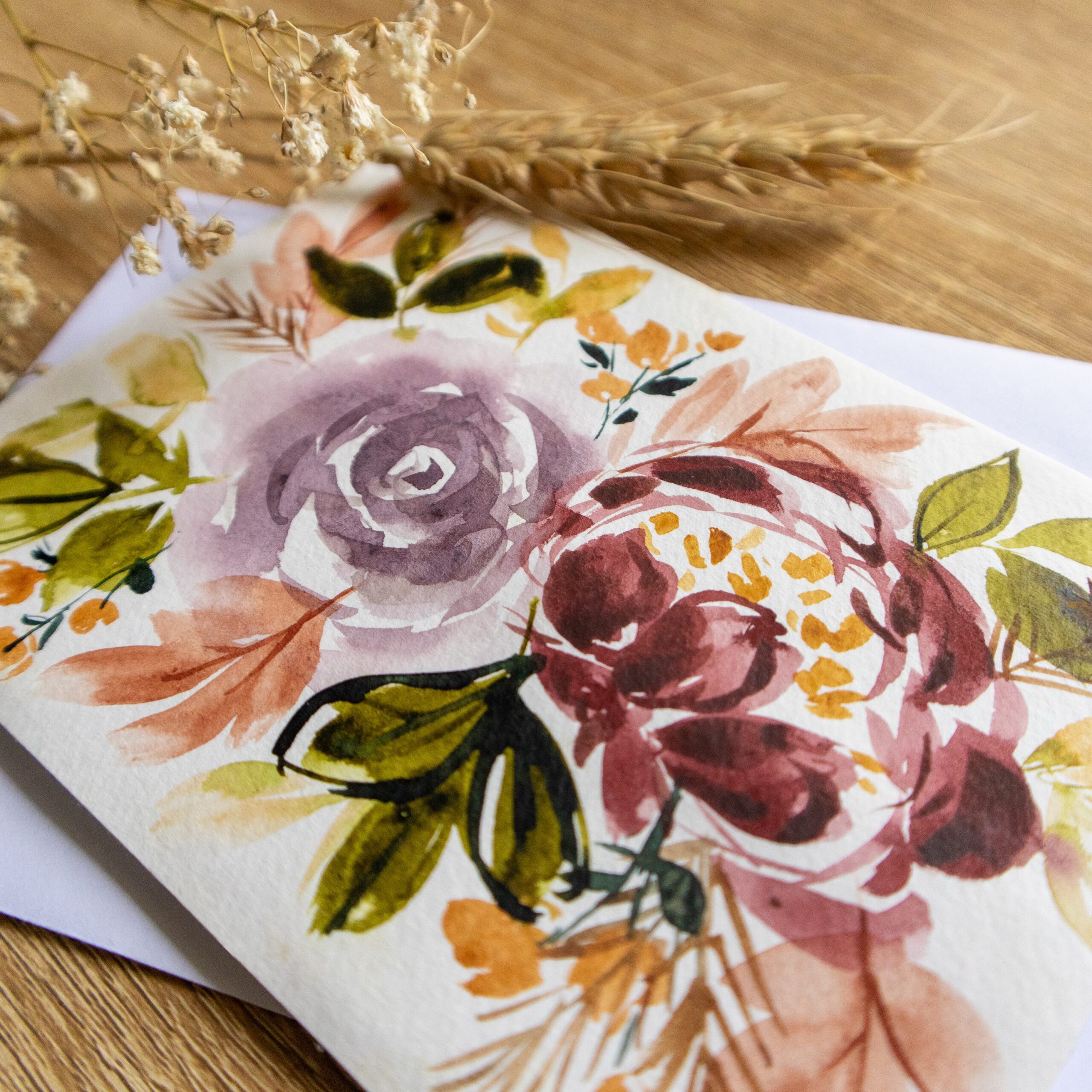 Hand painted greeting card with autumn coloured flowers perfect for the autumn season when the leaves are changing colours and dropping. With a blank interior to write your message, with a hand made touch on the outside.