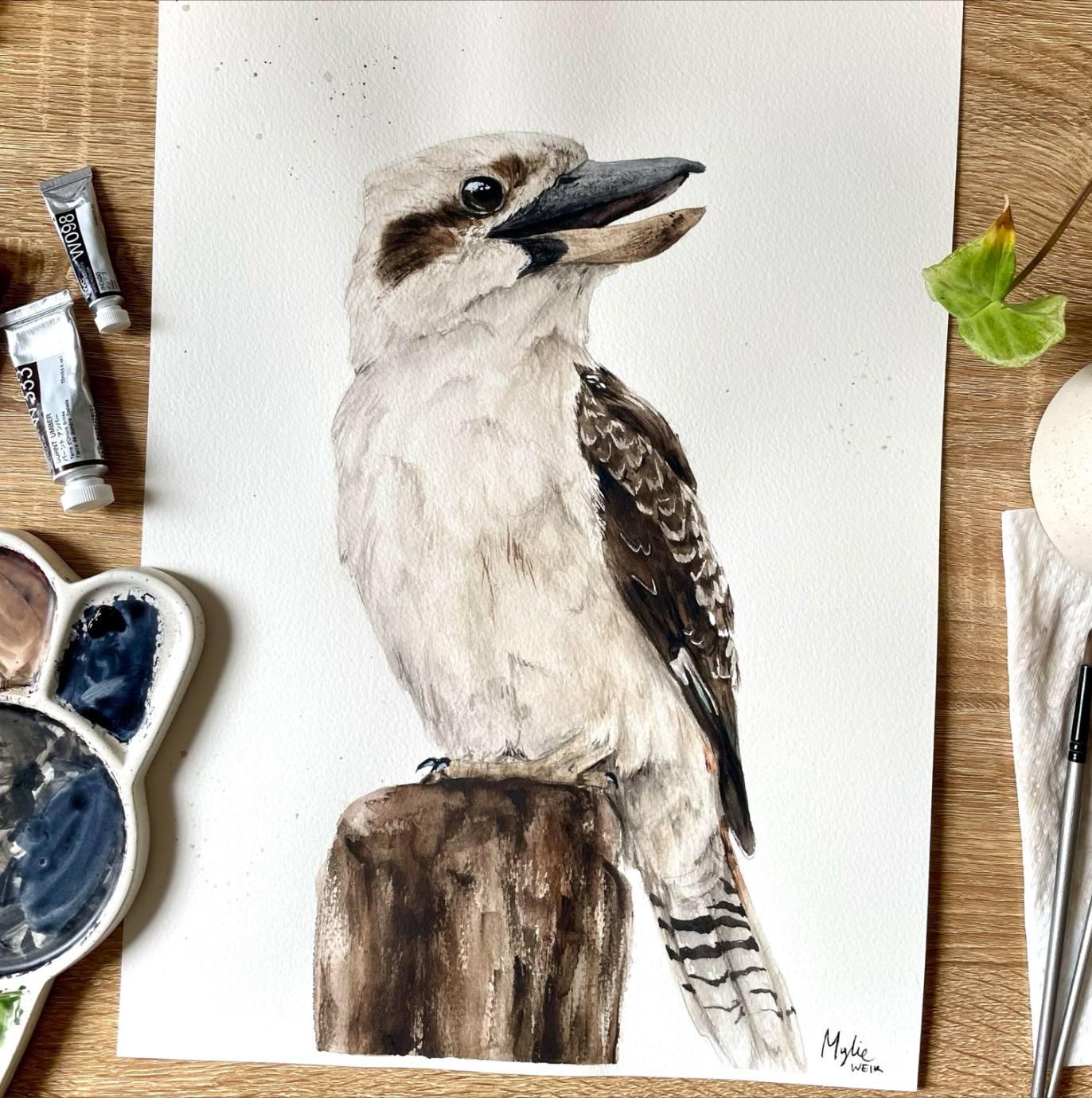 The original painting of ‘Kookaburra Reign’ Created with professional Holbein paints on 100% cotton Saunders Waterford watercolour paper. Painted in my home studio – Tamborine Mountain.
