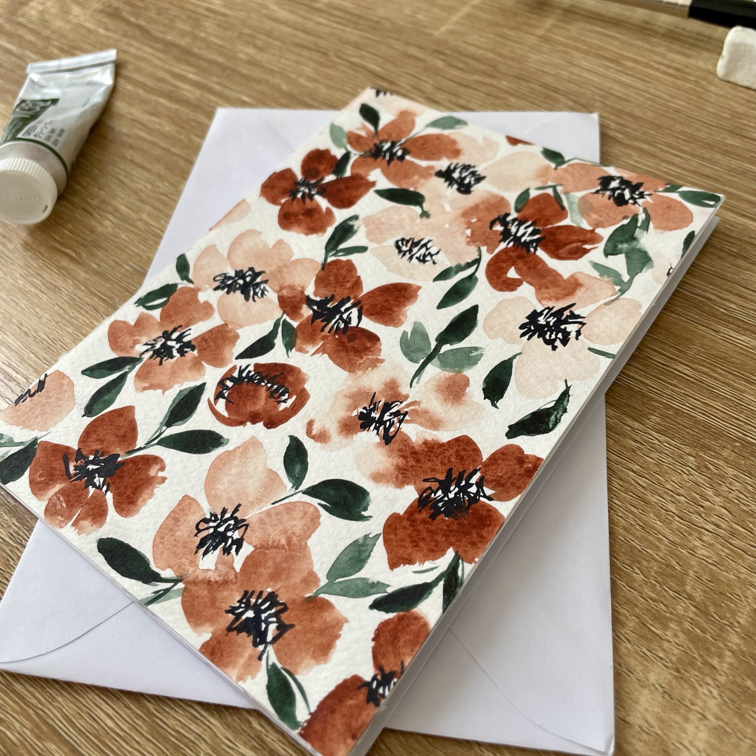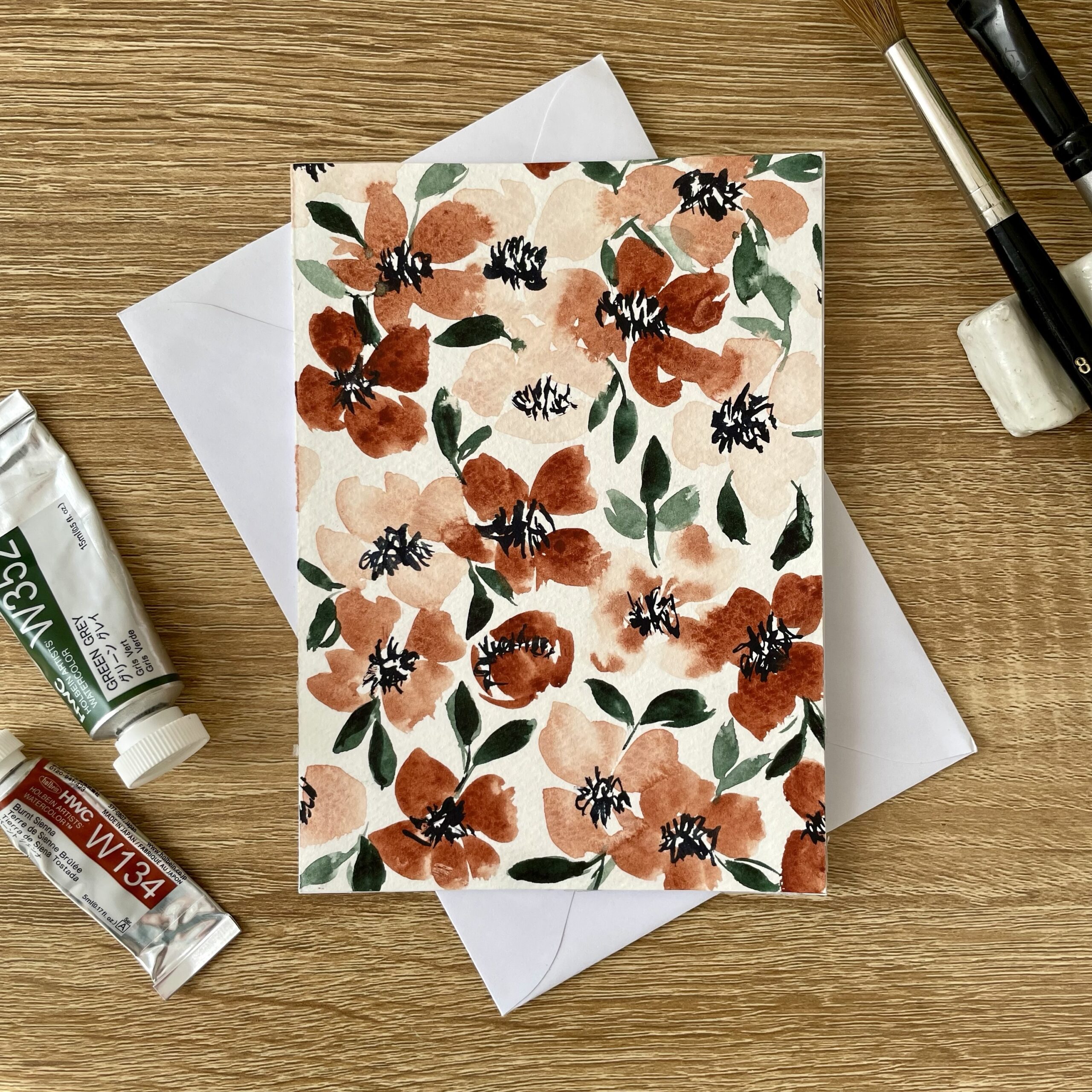Hand painted greeting card with loose watercolour flowers. Perfect for any female card occasion. With a blank interior to write your message, with a hand made touch on the outside.