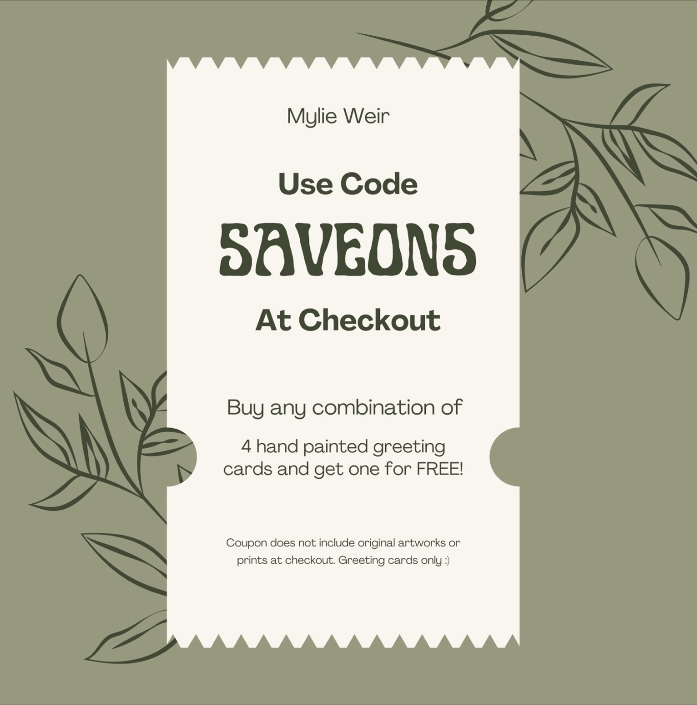 Buy a combination of 4 of my greeting cards and get one for free! Use the code saveon5 at checkout.