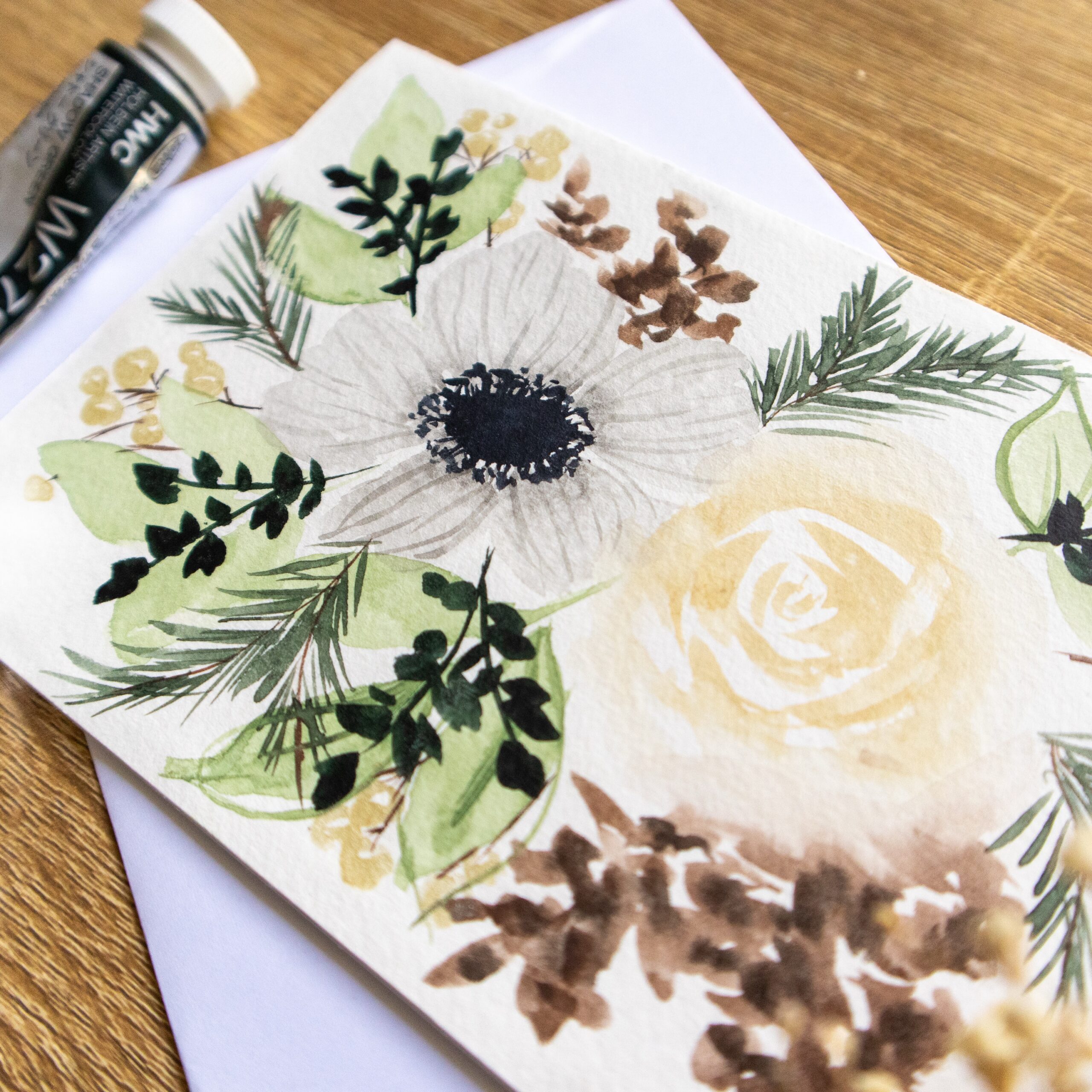 Hand painted greeting card with winter florals perfect for the winter season and winter birthdays! Treat your loved ones with a hand painted card for their birthday. With a blank interior to write your message, with a hand made touch on the outside.